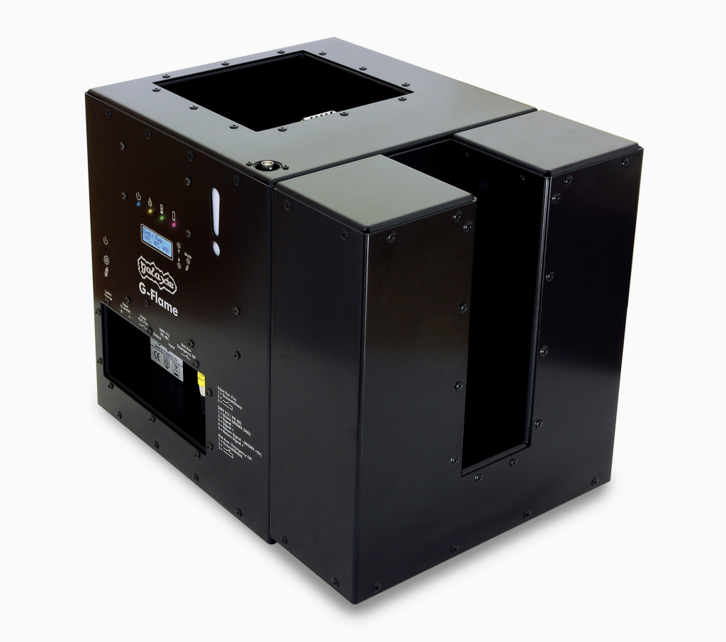 Die G-FLAME ist ein Flammenprojektor auf Gasbasis. Sie kann sowohl mit Gasflaschen (in Flüssigphase oder Gas-Phase), wie auch mit 2 oder 4 Gaskartuschen (POWER-UPGRADE) betrieben werden. Der Einsatz ist sowohl Indoor, wie auch Outdoor möglich (regenfestes Gehäuse, Betrieb auch bei Starkregen möglich). Die Geräte werden über einen internen Akku mit Strom versorgt, der bis zu 60 Stunden Standby-Betrieb ermöglicht.