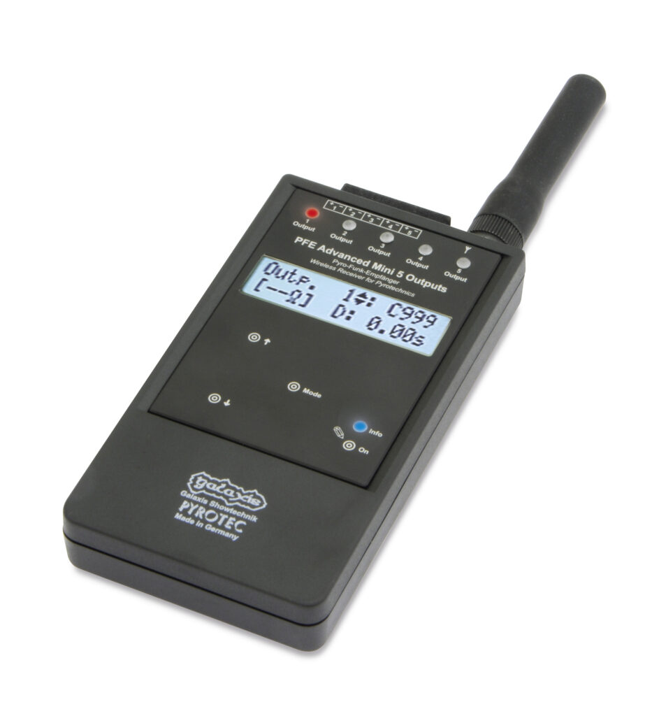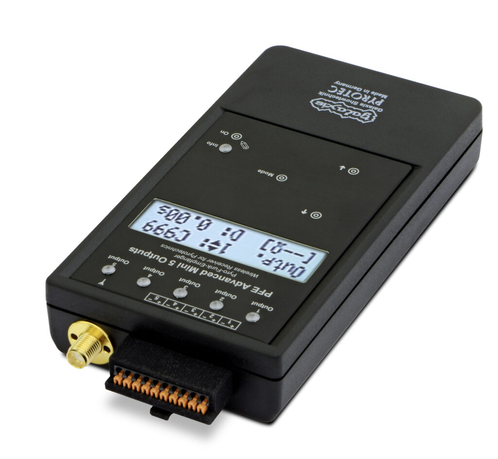 Der PFE Advanced Mini 5 Outputs ist der neueste Empfänger der Advanced-Baureihe. Dank seiner kompakten Baugröße ist er ideal für SFX und Bühnenpyrotechnik geeignet.